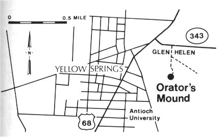 Orator’s Mound, so named because a pavilion from which speeches were given once crowed its summit, is a small (5’ high; 45’X39’ at the base) mound located on high ground midway between two branches of yellow Springs Creek, 1.4 miles north of its confluence with the little Miami river. Yellow springs, a perpetually flowing mineral spring, rises 550’ northwest of the mound. Part of Orator’s Mound has been excavated, and evidence recovered indicates that it represents the late Adena period. Orator’s Mound, also known as Glen Helen Mound, lies about 20’ south of the Inman Nature Trail in Glen Helen.