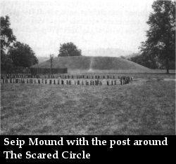Seip Mound is now a State Part. This mound was explored by archaeologist of the Ohio State Museum. After exploration the mound was rebuilt and the area converted into a park in 1930. The central mound is 200 feet high, and 30 feet wide. More than likely the mound was built to cover the remains of a charnel house. Present are also postholes of a large ceremonial center estimated to be 38 ½ feet by 35 feet in size.