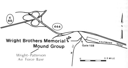 Directions: Exit Ohio route 444 onto Kauffman Road eastbound, go .15 miles E on Kauffman Rd., then about 250’ S on M Street to gate 15B. Entrance to Wright Brothers Memorial is to the W of the gate 15B. The mounds are beyond the end of the memorial drive.