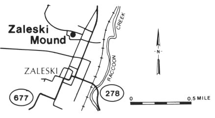 Directions: from intersection of Ohio route 278 and 677 in Zaleski, follow route 278 N .3 mile, then go W at Zaleski Elementary Scholl for .2 miles into Zaleski State Forest (via state forest road 17) and mound 1. Parking is available near the mound. The trailhead for the Zaleski backpack trail is located alongside route 278 5 miles N of Zaleski. Parking is available at the trailhead.