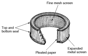 Parts of a paper filter for an air cleaner. The filter element is made from pleated paper. The pleats provide the maximum surface area for air to pass through. A fine mesh screen is used to support the paper element and protect against the fire hazards of an engine backfire. A top and bottom seal provides an airtight seal for the filter in the housing. Sealing is important because any air that does not go through the filter on the way into the engine could contain dirt.