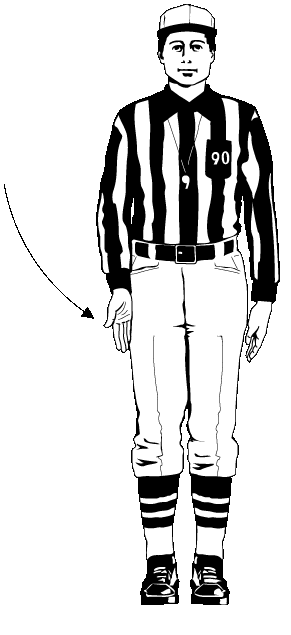 Strike of an open right hand against the right mid-thigh preceded by personal foul signal.