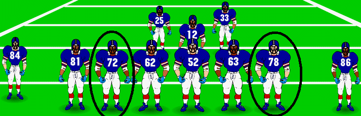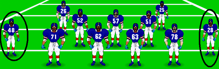 In this formation, you have just two defensive linemen on the field, normally defensive tackles (DT). In the middle of the line, where the nose tackle would normally be, is a linebacker (LB). Two more linebackers line up as ends, outside the defensive tackles. The last two linebackers line up behind the defensive line. Two cornerbacks (CB), one on each side of the field, line up to cover the wide receivers. There are also two safeties. The exact positioning of the defensive backs(cornerbacks and safeties) depends on the type of pass coverage they are in. 3 POINT STANCE: See three Point Stance 33 STACK See 3-3-5 DEFENSE 3 YARDS AND A CLOUD OF DUST See Power Football