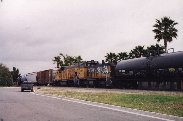 This is just before the train crosses Beach Blvd. This was taken before the closure of the Paramount Branch, and the Huntington Beach job would run down the HB Branch a short ways and couple up to a string of oil tank cars parked on the branch in Anaheim. They would then shove the tank cars up to Stanton Junction and leave them at the wye, proceeding down the Huntington Beach Branch to complete their switching duties there. They would then return in the late afternoon, couple up to the tank cars, and run down the Paramount Branch to a refinery in Paramount. A new rail connection was recently built there, eliminating the need for the Huntington Beach local to make this circuitous detour. Alas, I was never able to get photos of this operation.