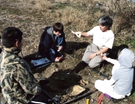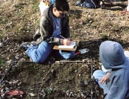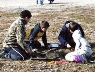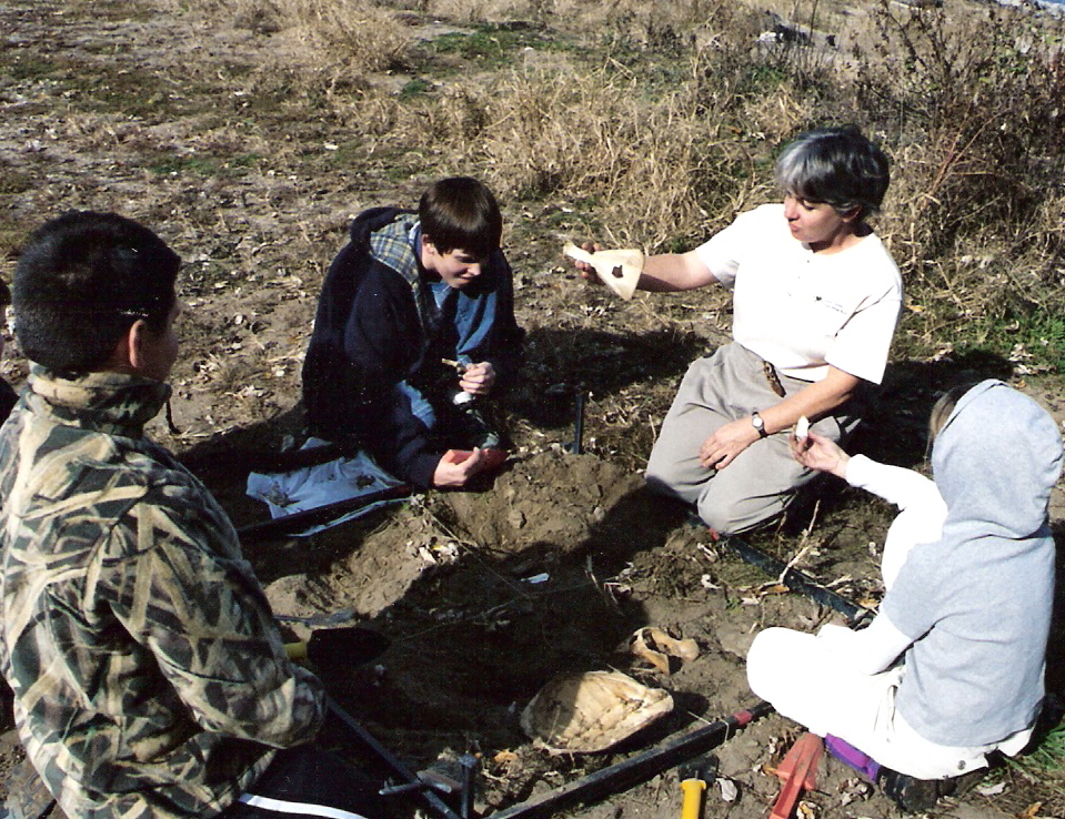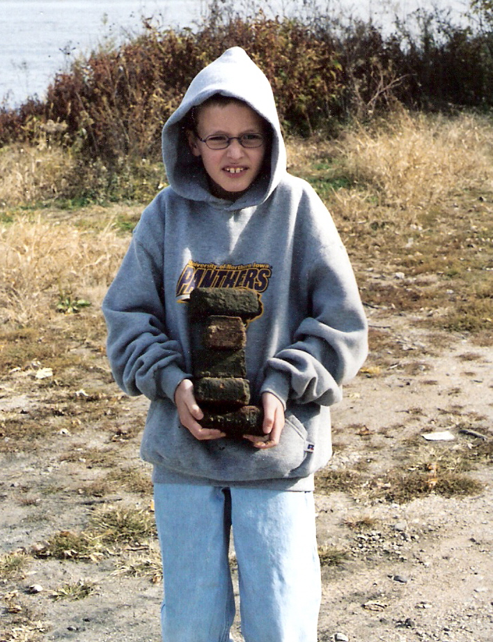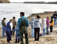 At Toolesboro we toured the museum and watched a movie about archeology. Then we went outside in the yard where we played Native American games with homemade equipment. Some of the games were dart throwing, buffalo robe, a game with a small bone hoop tied to a stick where the hoop was flipped up and we attempted to catch the hoop with the end of the stock, and beaver lodge. This was like the modern day "pick up sticks" game, but played with just ordinary sticks dumped on the ground and you had to remove a stick without bothering the other sticks. The games we played at Toolesboro were great fun. When we were at the Mississippi Rover landing near Toolesboro we learned the history of Louisa County since the beginning of time and I found some bricks from the Burris City Hotel. Burris City was a town that is completely gone now, but was there. The flooding from the Mississippi and Iowa rivers in 1858 destroyed the town. The town was never rebuilt. We also did some archeology work. We had to find some "artifacts" that were buried in specific spots. We used a hand shovel and a brush to find them carefully. There were 3 squares boxed out and some of us were at each square. We had draw on a paper what we found where and then we had to decide as a small group what time frame our boxed square stuff came from and who used them. Then we went to Langwood and had lunch. After lunch we did more activities like the Native Americans would have done before the Europeans came to the area. One activity was cutting squash with a mollusk shell that was sharpened to use as a knife. We put the slices on a stick like a skewer. They would have been dried for use throughout the winter. Another activity was making rakes or hoes with a deer antler, scapula, sticks, and wet rawhide strips. The wet rawhide was used because when it dried, it would shrink and tighten the tool. Another activity was scraping hair off a deerskin with rocks that had a sharpened edge. Another activity was nuts. We used a flat rock and a pounding rock to break open hickory, white acorns, black walnuts, and chestnuts open. I didn't do that one because I didn't really want to eat nuts. The last activity center was grinding corn. There are two ways to grind corn. One was using hallowed log and a stick to smash the kernels inside the log. The other way was using rocks - a flat one and a small one. The small one was used to pound and twist the corn kernels on top of the flat one. Then the ground corn was used to cook with, depending on how fine the corn was ground.