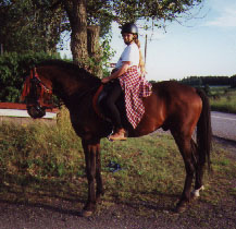 Här är jag 11 år och *Ale* är 6 år. På den tiden var han hingst fortfarande, (världens snällaste!!!) Ser du vägen alldelens bakom oss? Det är riksväg 68 (!) - här efter den red vi varje dag!! Det var tung trafik 24 timmar om dygnet, långtradare, lastbilar, motorcyklar,pers.bilar, traktorer, ja allt! Vi fick rida efter denna väg ett par hundra meter för att komma till skogsridvägar, det fanns ingen gångbana så man fick rida på själva vägen - men *aldrig* att Ale Way bråkade eller någonsin blev rädd då trafiken for kors & tvärs omkring honom!! 100 % trafiksäker - det kunde man lugnt konstatera att han var...