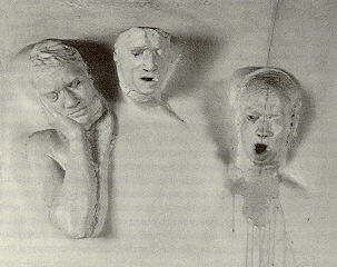face fragments staring out while a fuller bust, jaw pressed to palm, leers disapprovingly. Onto this three-dimensional
