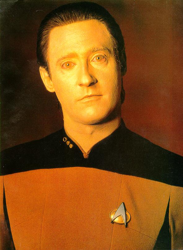 No, he doesn't have a bad case of jaundice and don't you dare say he's a toaster!! Data is an android, gottit? AN-DROID. Okay, now that we've got that off our chests... Data was created by Dr Noonien Soong, and his wife Juliana, around 2335 on the isolated Omicron Theta outpost. Not long after his constuction, the colony was attacked by the Crysatalline Entity and his 'parents' fled, leaving him behind in a secret cave. He was discovered by the crew of the Starship Tripoli (NCC-19386) in 2338, subsequently joining Starfleet. Data's body closely mimics human form (with the exception of the colour scheme... and, yes, he's 'fully functional, programmed in multiple techniques'), and contains approximately 24.6k of triploymer composites, 11.8k of molybdenum-cobalt alloys and 1.3k of bioplast sheeting. Oh, and he may or may not have some biological components - depends on who you ask. Prior to his assignment on the Enterprise, Data served aboard the USS Trieste (NCC-37124). During his tour-of-duty as second officer on the Enterprise Data has: copped off with the security officer, had his rights as a sentient being challenged by some jumped-up scientist who wanted to pull him to bits and see what made him tick, discovered he had an evil brother, saved an omnipotent being that wasn't so omnipotent from being killed by a giant squid, been father of the bride at a friends wedding, been assigned command of a starship during the Klingon civil war, been thrown back in time to the 19th century, tried to grow a sense of humour (didn't work), acquired a cat (Spot), copped of with yet another chicky, started having dreams about birds and miners, developed multiple personality disorder when an alien archive invaded his systems, created a daughter (Lal='beloved' in Hindi) who snuffed it about two weeks later, finally managed to have his emotion chip installed and copped off with the Borg Queen. Busy boy! Please continue the petty bickering? I find it most intriguing -- "Haven"