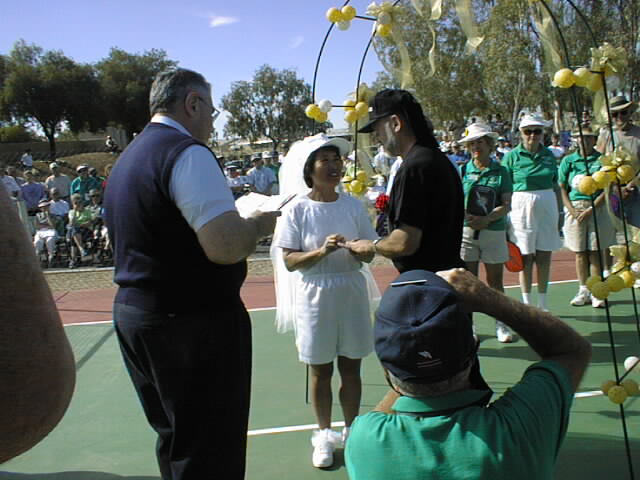 On February 20, 2002, Barney Myer and Fran Trinder were joined in pickleball matrimony at the Arizona Senior Olympics held at Happy Trails Resort in Surprise, AZ. The ceremony took place at the Happy Trails Pickleball Chapel. After passing through the "Traditional Pickleball Arch" the couple exchanged vows in a ceremony performed by the pastor, Dr. Roger Ottersen. Over 150 pickleball players and well-wishers joined them afterwards for cake and punch.