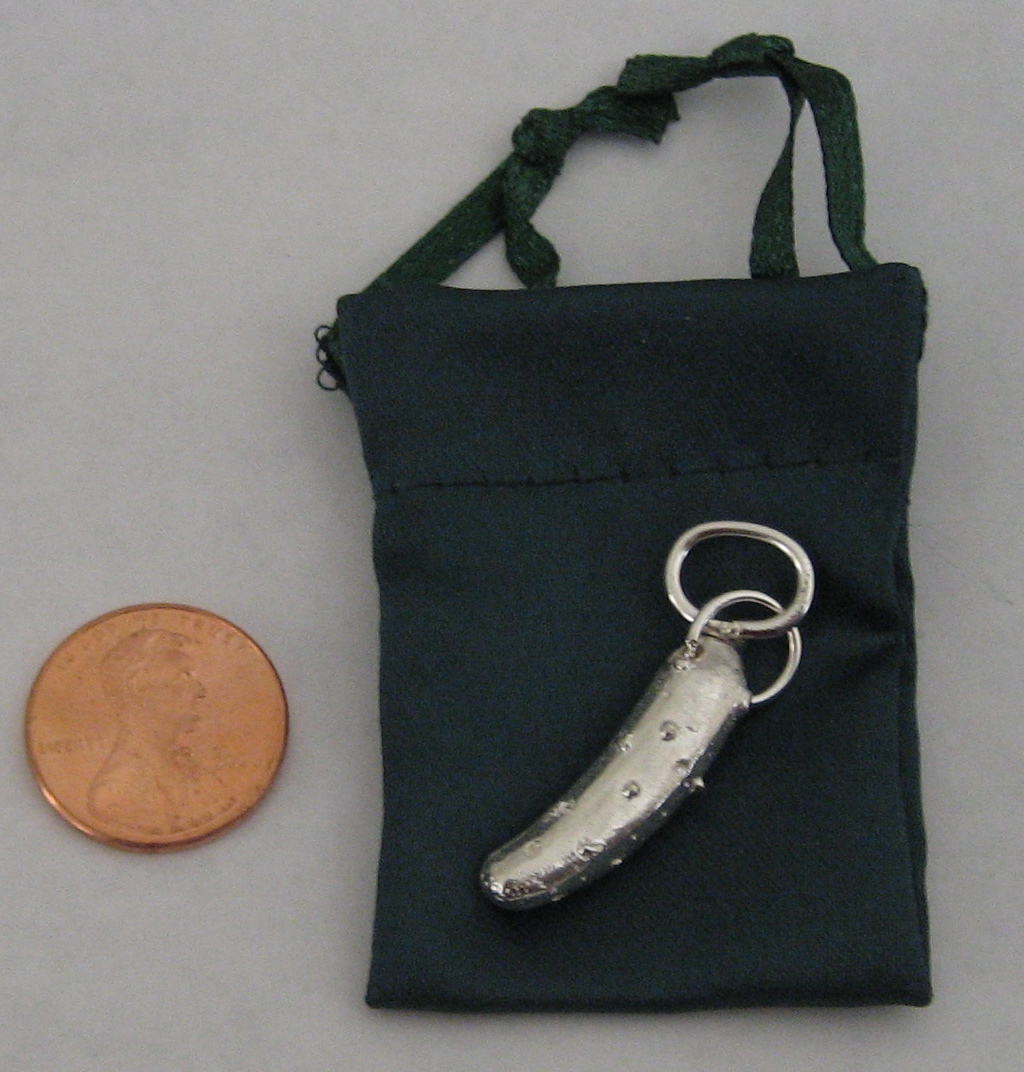 | Sterling Silver Pickles This beautiful, quality sterling silver pickle has been created especially for pickleball players by artist, Judith M. Helfrich. Her pieces have been included in shows at the Schenectady Museum, the Shaker Museum in Albany, NY and other locations. She has also won show awards for her work. Now you can purchase some of these pieces to give yourself or a pickleball enthusiast that pickle pizzaz. $18.00 for each Pendant or Tie Tack. $36.00 for each pair of Earrings. Visit Judith's website jhelfrichdesigns.com, email her at helf123@aol.com or call 518-875-6101 to order these pickles directly from her. Great gifts. Comes with pickle sized gift bag (as shown). Also available from Pickleball Stuff. See picture of pendant here. | SP840 | $18.00 Per Pickle $36.00 Per Pair of Earrings | |||