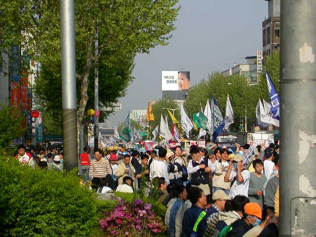 South Korea has a rich history of in-your-face student and street politics. This was one demonstration I saw on May 1 2003 -- plenty of colorful flags and banners in the Asian style, flying in the beautiful spring sunshine.
