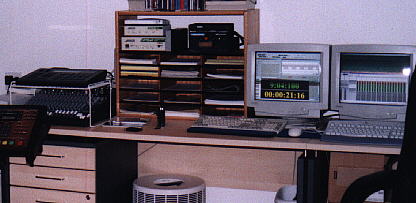 32 tracks Alesis ADAT 20 bit & 24 tracks MOTU 2408 HD, Alesis BRC remote control, Mackie 32/8 Console with 24 expansion channels, Mackie CR 1604 VLZ submixer, Tascam CDRW 5000 CD Burner, Tascam DA-302 mixdown deck (DAT), Tascam 302 mixdown deck (cassette), Yamaha KX-W282 Mixdown Cassette Deck, 3 RNC compressors, Behringer MultiGate, Aphex Aural Exciter Type C2, 2 Behringer UltraQ PEQ's, 2 Lexicon MPX1, Alesis M-EQ 230 graphic EQ, Alesis 3630 Comp/Limiter, Alesis Midiverb II, Alesis Midiverb IV, DigiTech Studio Vocalist with pitch control, Roland RE-201 tape echo, Fostex 250 recorder, Furman Line Voltage Regulators