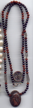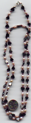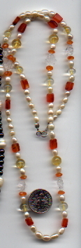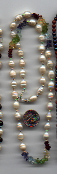 These are six necklaces I've made from various gemstone bead materials. All the findings (clasp, jumploops, bead tips, liquid silver tube beads and 2mm spacer beads) are all made of genuine sterling silver. Look at the patterns, colors and textures. They are pleasing to the eye, and none of them are 'extreme.' Any of these necklaces could be worn clubbing, or in the board room. The leaf shaped beads are carved Rock Crystal, which can be very expensive. Buy in bulk whenever possible and save your wallet! There are two kinds of freshwater pearls shown here. The long smooth ones are freshwater rice pearls, and the rounder ones are pond grown freshwater pearls. The pond grown pearls were three times the cost of the regular freshwater pearls, however the pond grown pearls have a deep lustre and nacre, and I've yet to find any as nice. Please note that Rose Quartz will fade in direct sunlight, so be careful where you store it when not in use.