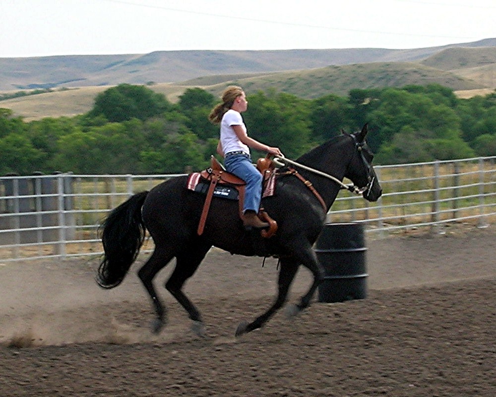 Jackie doing barrel racing on Mouse