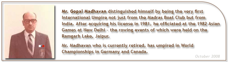 Gopal Madhavan, Chacko Kandathil, Rowing, India, Madras Boat Club, Chennai, International Umpires, Umpires, Rowing Federation of India, Asian Rowing Federation