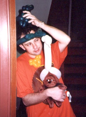 This is a picture of me and John the day after 'Big Wednesday'. That involved waking at 8am Tokyo time, crossing a date-line and getting to bed later that same day at midnight in Western PA, after being awake for approx 37 continuous hours.... (apart from maybe twenty minutes over the North Pacific when John tried to take a nap, using ME as a pillow! How Rude! How Not Very Comfortable.. hehehe!). I was feeling fine (us apes are made of tuff stuff - and Fully Machine Washable, it says so on my label!), but poor ol' John (I have no sympathy really) was trying to blame all sorts of silly behavior on Jet Lag. Hmmmphtt! Our first sight of native Amerikan Fauna was when we got attacked by vicious balloon animals. We were lucky to survive...