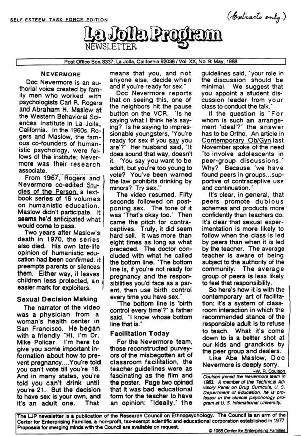 Two years after Maslow's death in 1970, the series also died. His own late-life opinion of humanistic education had been confirmed: it preempts parents or silences them. Either way, it leaves children less protected, an easier mark for exploiters.