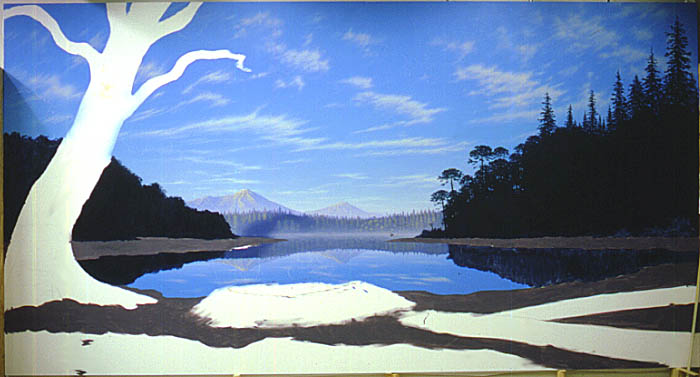 Here I've begun painting in the trees in the middle ground. The underpainting for the trees is a dark blue, over which will be painted the details of leaves, etc.