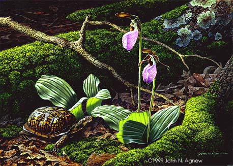 An Eastern box turtle and a Northern copperhead meet near a Pink Lady's Slipper on a wet May morning somewhere in the Appalachian Mountains.
