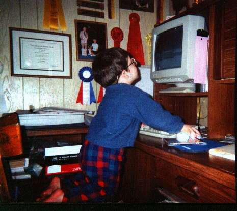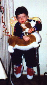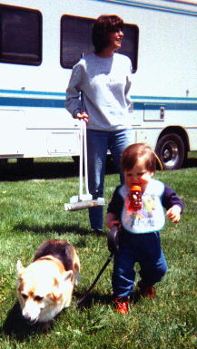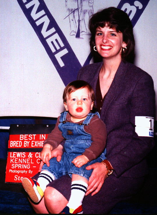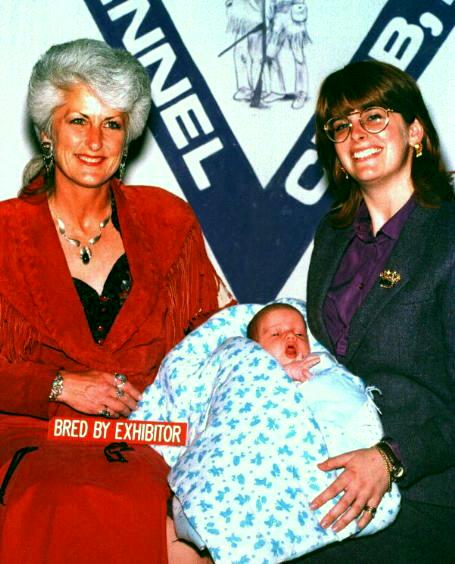 | When Camden entered our lives, we weren't sure we were ready for "Grandparent-hood" but this little boy has brought immearsurable joy and happiness to our home. He lived with us from birth until he was 2 1/2 when he and his Momma moved back to Seattle. He is shown pictured here attending his first Dog Show, April 12, 1997, at the ripe old age of two weeks and, obviously, upset because he was not allowed to handle to the win! | ![]() |