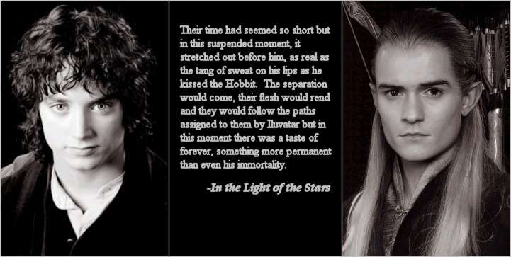 Notes and Warnings Author's Notes: This is my first Lord of the Rings fan fiction (even if I've read the trilogy about a million times in the last 10 years or so), so I'm a bit nervous. This story falls somewhere between the movieverse and the bookverse. While I've tried to stick mostly to what happened in the movies, I have incorporated bits of the books in (such as the names of places and other such). There are also brief references in here to a story I'm writing right now, which will serve as a prequel of sorts to this one. The title for this story was inspired by a Loreena McKennitt song, "Dante's Prayer" which can be found on her 'Book of Secrets' album. Special thanks to: My evil betas Amet, Anne, and theVault. I could not have done this with out you guys. *Hugs* Feedback: As always, I would love to hear from you guys. Disclaimer: As much as it pains me, I own neither the characters nor the concepts of Lord of the Rings. They are the property of the Tolkein estate and New Line Cinemas. Pairings: Legolas x Frodo Warnings: As I indicated earlier, this fic is NC-17. If you are under-age or the idea of m/m sex squicks you, then I would suggest you not read rather than flame me. '....' Indicates thought The Light of the Stars Sephy 02.07.02 In the Light of the Stars Banner courtesy of Amethyst Maiden | |