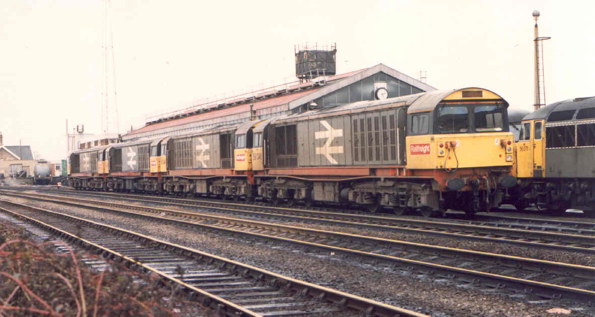 The first livery carried was the then new Railfreight grey with yellow cabs and a red solebar. The livery was very striking and suited the locos well. Some of the later ones had metal "Railfreight" plates fitted to the cab sides or fronts.