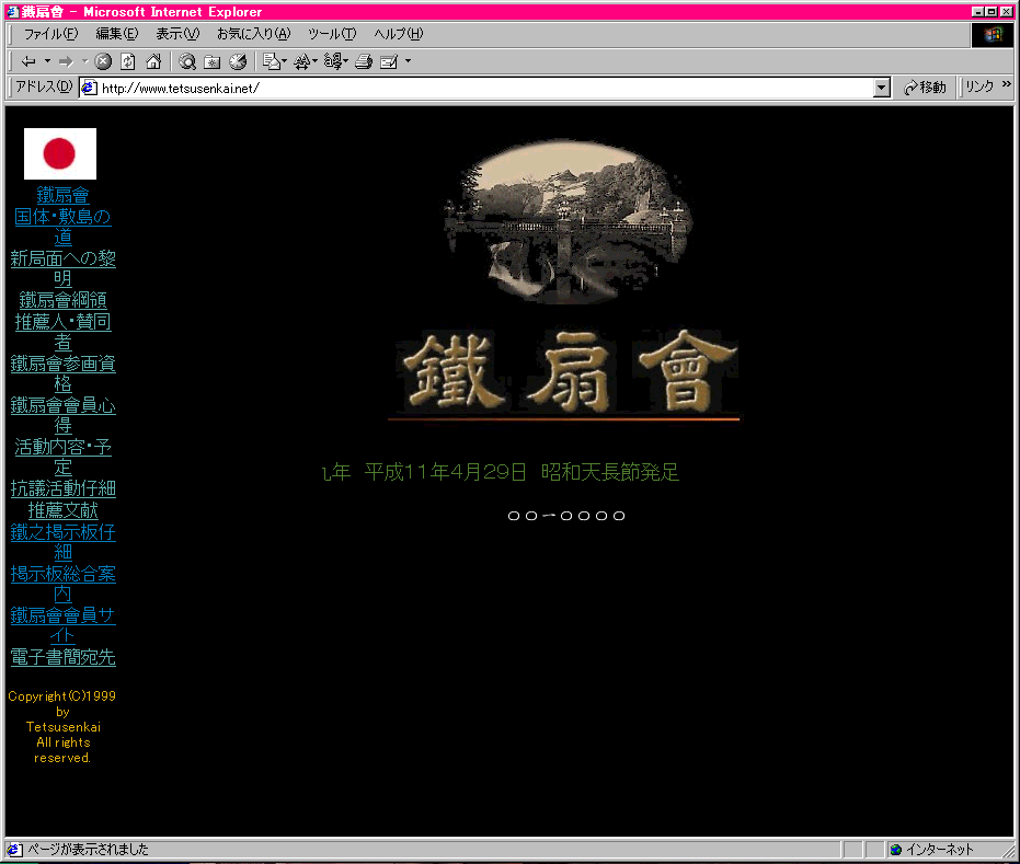 - 鐵扇會公式掲示板「鐡乃時代」で、「てめへら本當に右翼か、やつてゐることはまるで左翼ぢやないか」等と言放つて削除處分をくらつた時の記録。當時、鐵扇會は相當慌てたらしく、會員專用掲示板で何らかの聲明を發表したらしい。