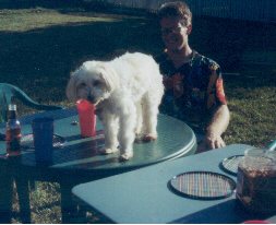 Me walking out of a cabin on our Vacation June 2001 & Rascal standing on our outside table for a BBQ