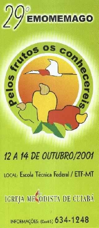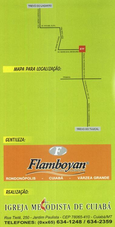 Vigésimo nono encontro da mocidade metodista dos distritos de Mato Grosso e Mato Grosso do Sul “... Nem os olhos viram, Nem os ouvidos ouviram Nem jamais penetrou em coração humano o que Deus tem preparado para aqueles que o amam. Mas Deus no-lo revelou pelo Espírito...” 1 Co 2.9 - 10a Querido irmão e irmã. Venham participar conosco do 29.o EMOMEMAGO, que visa a integração da mocidade metodista dos Distritos de Mato Grosso e Mato Grosso do Sul e traga na sua bagagem muita disposição para ver, ouvir, sentir e também para levar o melhor que Deus tem preparado especialmente para você. Pr. Eduardo Gabriel Colhante. O QUE TRAZER - BÍBLIA - Colchonete, roupa de cama, objetos de uso pessoal, roupa de banho e touca para piscina, roupa para prática de esportes e medicamentos de uso diário. LOCAL DO ENCONTRO ESCOLA TÉCNICA FEDERAL DE MATO GROSSO Rua Zulmira Canavarros n.º 95 – Centro – Cuiabá/MT Veja o MAPA para melhor localização COMO FAZER SUA INSCRIÇÃO - Imprima e preencha a FICHA de inscrição - Faça o depósito bancário, de acordo com o plano de pagamento escolhido - Envie a ficha e o comprovante do depósito pelo correio para o endereço da Igreja Metodista de Cuiabá logo abaixo ou envie por E-mail MAIORES INFORMAÇÕES - IGREJA METODISTA DE CUIABÁ Rua Tietê n.º 250 – Jardim Paulista – CEP 78065-410 – Cuiabá – MT TELEFONES : ( 0 XX 65 ) 634-1248 e 634-2359 Home Page da Igreja Metodista de Cuiabá - página inicial DADOS PARA DEPÓSITO TIAGO DE OLIVEIRA MARTINS Banco : HSBC AGÊNCIA : 0233 CONTA/CORRENTE : 2125226 |