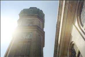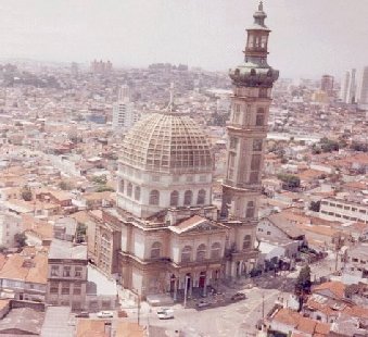 Conheça-a. Visite também a torre. Em forma oitavada, de 10 mts de diâmetro por 93,60 mts de altura, onde distribuem-se grandes moldurões, colunário, cúpula e mirante, além de diversos vitrais. Possui escada com 407 degraus, além de elevador para 15 pessoas.