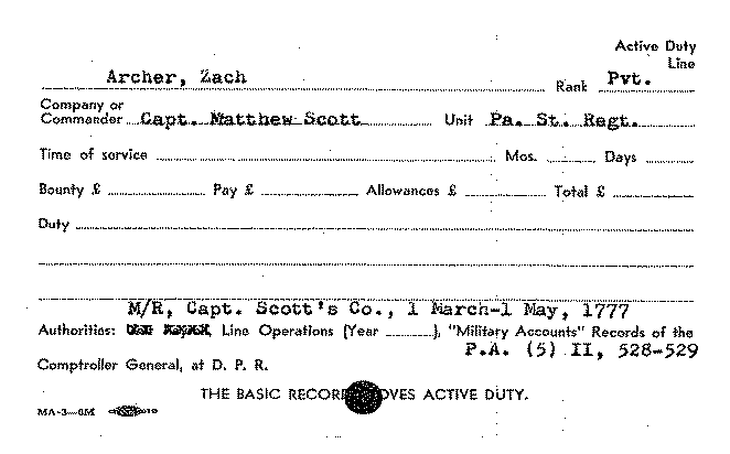 He transferred, 1777, to the PA. State Militia, Cpt. Matthew Scott's