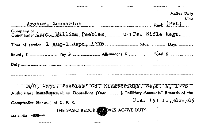 Samuel Miles' PA. Rifle Regiment, 2nd BN., Cpt. William Peeble's