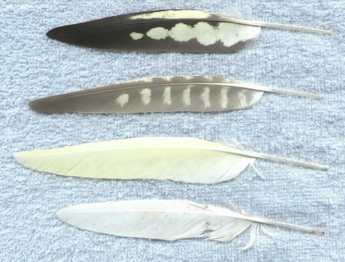 This picture shows primary wing feathers. These feathers are found on the outermost portion of a bird's wing. The first feather is from a normal pearl female. Notice the yellow "pearl"-like spots on this feather. The second feather is from a cinnamon pied female. This feather is more brown, rather than gray in color, and has yellow "bars" on it. It is called wing barring and is seen in immature birds and adult females. The third feather is from a normal pied male. This feather is yellow with white trim on top. The fourth feather is from an albino female. Because this feather lacks pigment, wing barring is not visible.