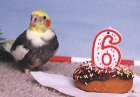 Here is a picture of me at my sixth birthday party. This picture appeared in a bird calendar. It was part of a fundraising effort to rescue Kiki, an abused African Gray bird. (He was rescued!) And, no, my Mom wouldn't let me eat the chocolate doughnut because chocolate is DANGEROUS for birds!