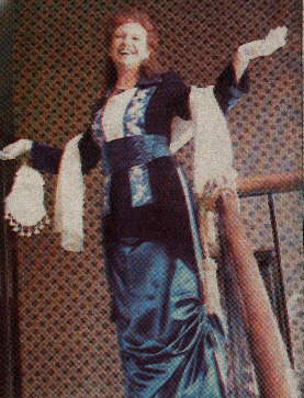 The accessories that I have also include a recreated Butterfly Hair Comb from the J.Peterman Company. This I was lucky enough to get from Ebay on auction. This is a beautiful recreation of the original butterly hair comb worn by Rose. This is a lovely butterfly that accents the hair beautifully. And of course, I have the"Heart of the Ocean" necklace as well. I do have the recreated jewely that Rose actually wore in the movie with the Flying Gown though. The necklace that Rose wore was a small gold pendant accented with a blue topaz gemstone. The ear rings are small pearl drop ear rings.