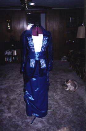 On the second top I hand embroideried the lapels. That was as the original was made. This is the version that I choose for showings. It is the closest to the original. The wide satin belt is tied in the back in a square knot. The remaining of the belt falls gracefully down below onto the skirt of the gown. This is a beautiful gown. The buttons on the tunic top are also covered with the blue satin as well. There are also deep navy tassels that hang from each corner of the top. There are four corners to this tunic top. These gown top is referred to as the peplum top.