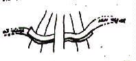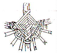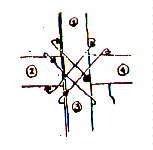 With the right side of the splint facing you, place the weaver on top of the hoop at the pencil mark. Move up and behind (1) diagonal to (2), behind (2) diagonal to (3), etc. From (4) go diagonal to (1) and repeat the entire counterclockwise revolution five more times. The starting point is covered as weaver moves from (2) to (3). DO NOT CUT the weaver off at this time. Secure it with a clothespin. Example of proceedure is below.