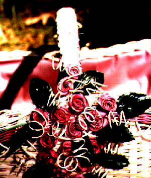 This is a closeup photo of the detailed roses on the basket. Each rose is made with 1/4" flat reed that has been dyed to the color that is desired for the basket flowers. The reed is then twisted and folded into the shape of the roses. The curls are made from small round reed that has been soaked in water and rolled onto a dial rod until thoroughly dry. Then it is taken off, cut into 2" pieces. The flowers and curls are then glued onto the basket with a hotmelt glue gun. The leaves are silk leaves and are also glued onto the basket.