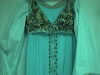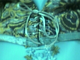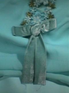 This is a close up view of the decorative trim and bow which runs down the front of the gown. The ribbon used for the bow is a velvety texture, and this ribbon was also used to trim the bodice.