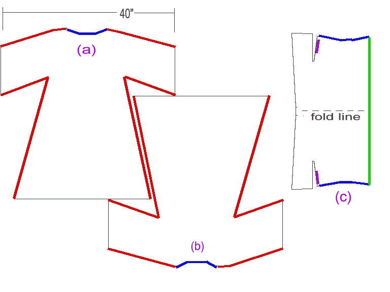The first thing to be sewed is the main cloak piece. As the red lines above indicate, sew (a) and (b) together.