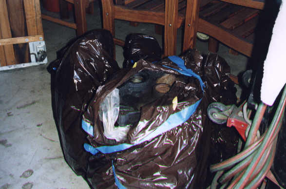 John's future 355cu.in. (5.7 liter bored 30 over)engine wraped up in bags sittin' on his garage floor.