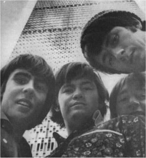 Micky Dolenz was standing in front of the group, wearing a pair of light blue shorts, and a white T-shirt, tossing a volleyball back and forth. Standing next to him was Michael Nesmith. Mike wore a blue windbreaker outfit, with a white stripe on the side, and perched on top of his head was his characteristic green wool hat. Next to Mike was the terminally short Davy Jones. In his little red shorts and sky blue jacket, Davy began to size up the group in front of him. Lastly, there was Peter Tork. He had on an outfit similar to Mike’s, but in red. His longish, light brown hair blew in the wind as his dark brown eyes curiously surveyed his surroundings.