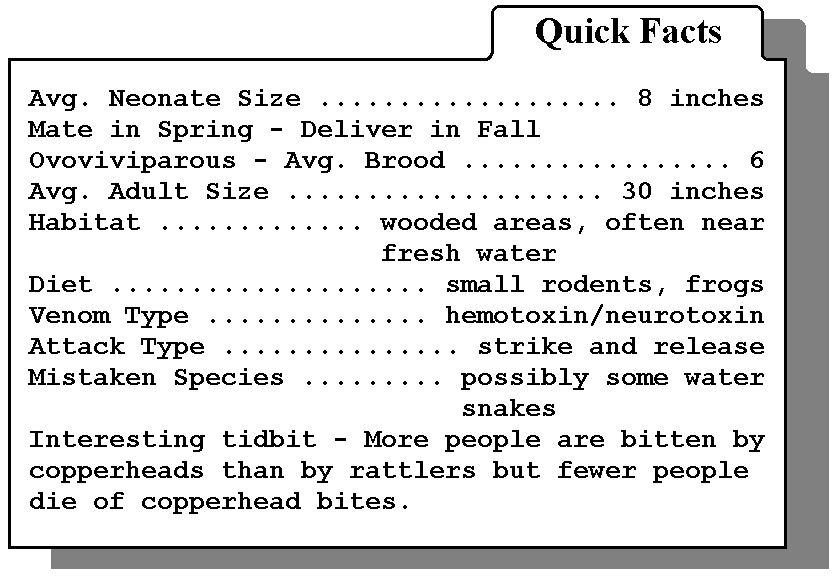 Newborn copperheads are up to ten inches long and their venom is already potent enough to kill prey.  This is important to their survival because the female leaves the young as soon as they are born.  The brood, consisting of 4 to 8 young, begins to disperse very soon.