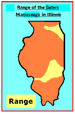 Massasaugas once occured in 26 Illinois counties, but appears to survive today in only 8 counties.  Because of their increasing rarity and low reproductive rates, they were placed on the Illinois Endangered Species List in 1994.  Heavy penalties are imposed for killing, collecting, or possessing Massasaugas or any part thereof anywhere in Illinois without a permit.