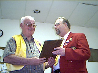 Lion Tom Stack is presented his 2003 Lion of the Year award by Dist 1B Governor at the April Dinner Meeting