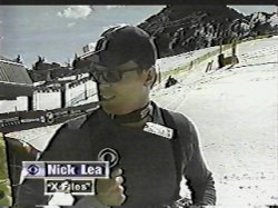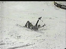 Nick wins the first race, but loses his hat at the end, then tumbles down the hill!! Maybe it's because he's wearing O.P (Other People's), and left all his ski gear in Canada. In the next race, he gets beaten terribly, and is out of the race. Unfortunatly, most of the interview at the bottom of the hill didn't come out well, so I couldn't "capture" it.