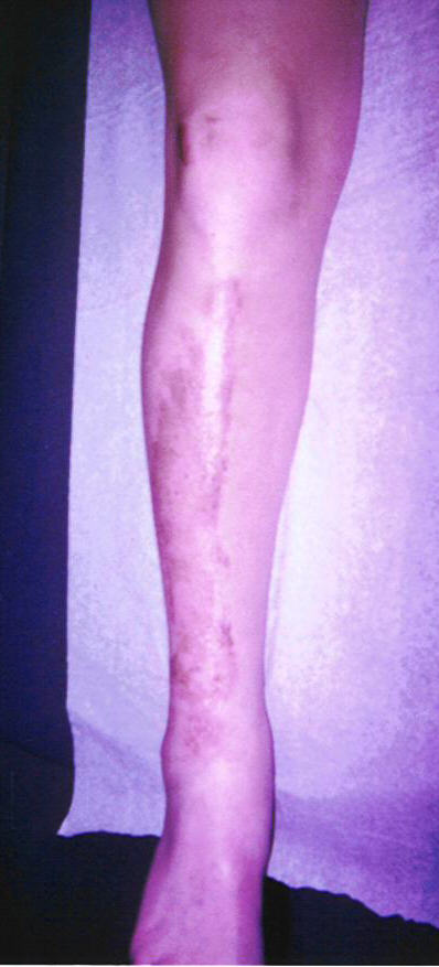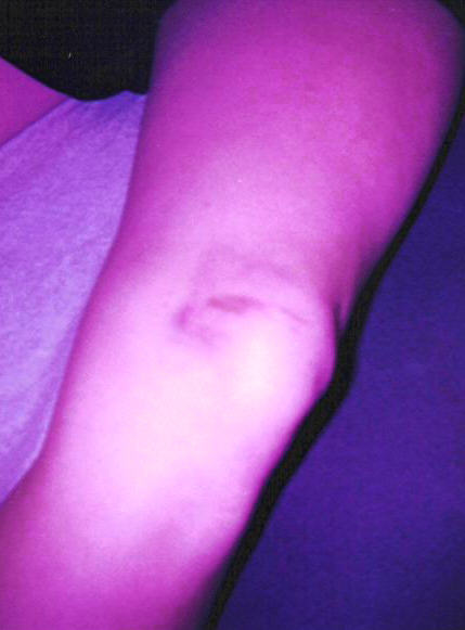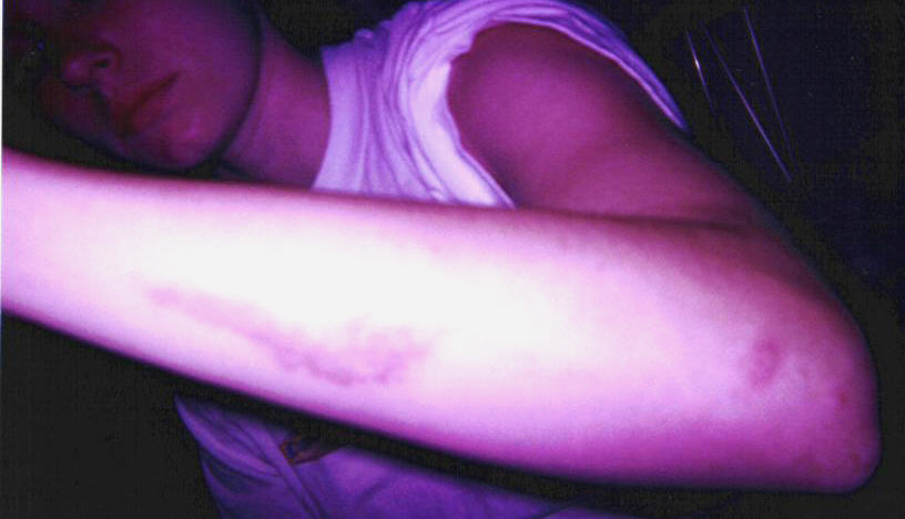 The big red abrasion was black the day before . . . the top couple layers of skin came off and grime from the car was burned into the abrasion.