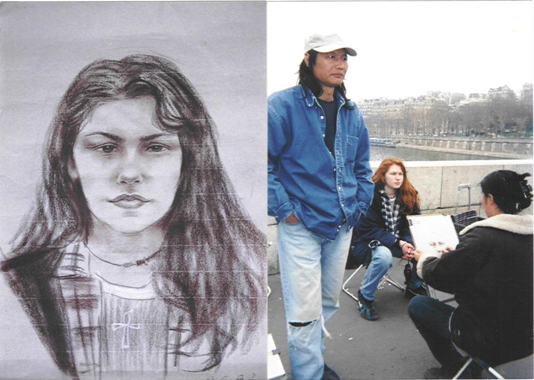 Getting my portrait done on the river Seine... to my right is the Eiffel Tower!