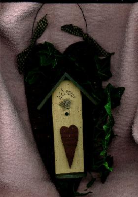 This Birdhouse and heart is 12 inches tall and has ivy draped on it.