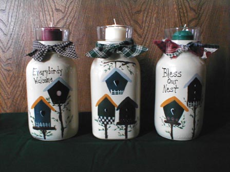 They hold a votive holder and a candle which are included. Each jar is tied with a coordinating strip of material.